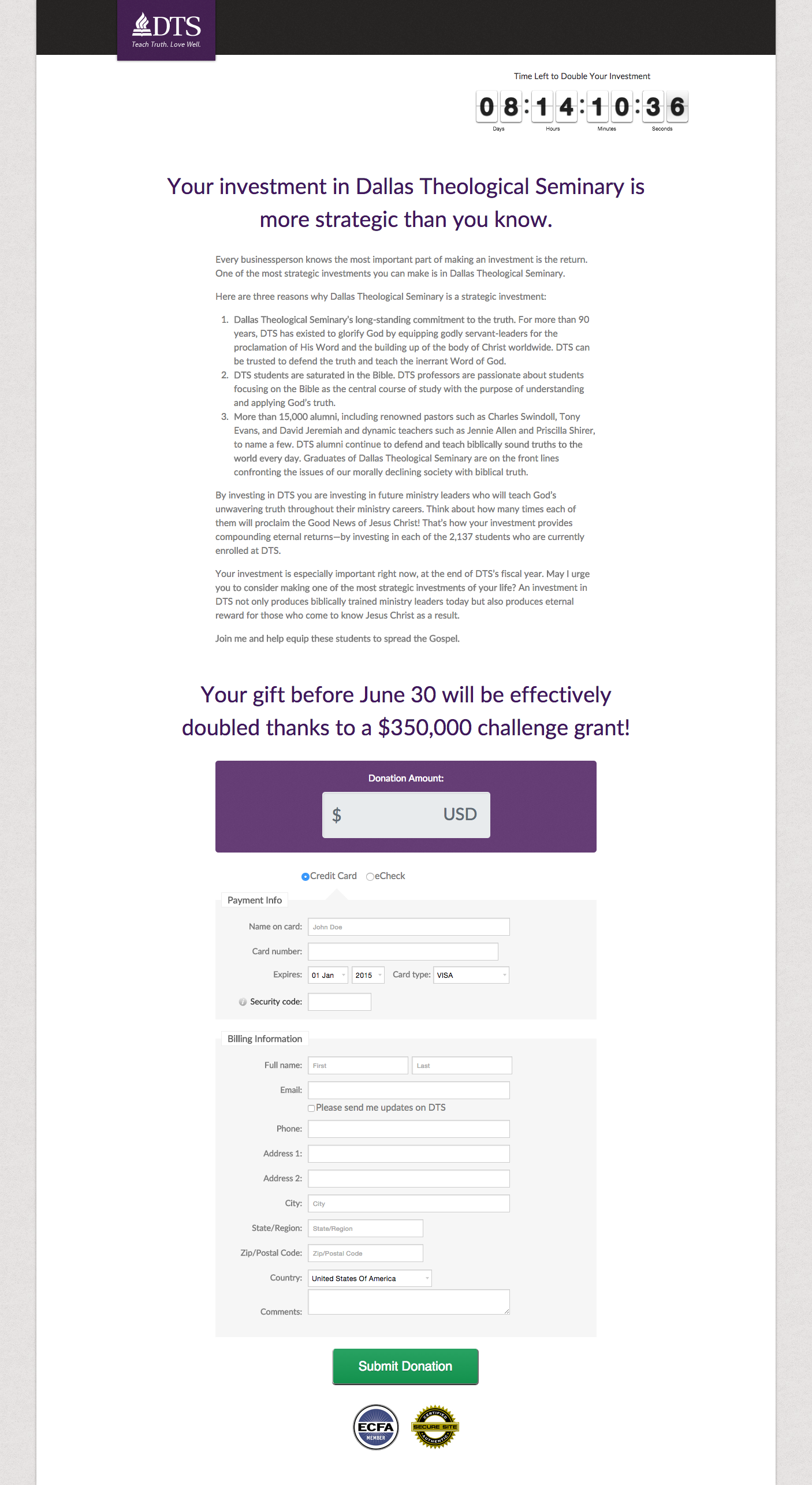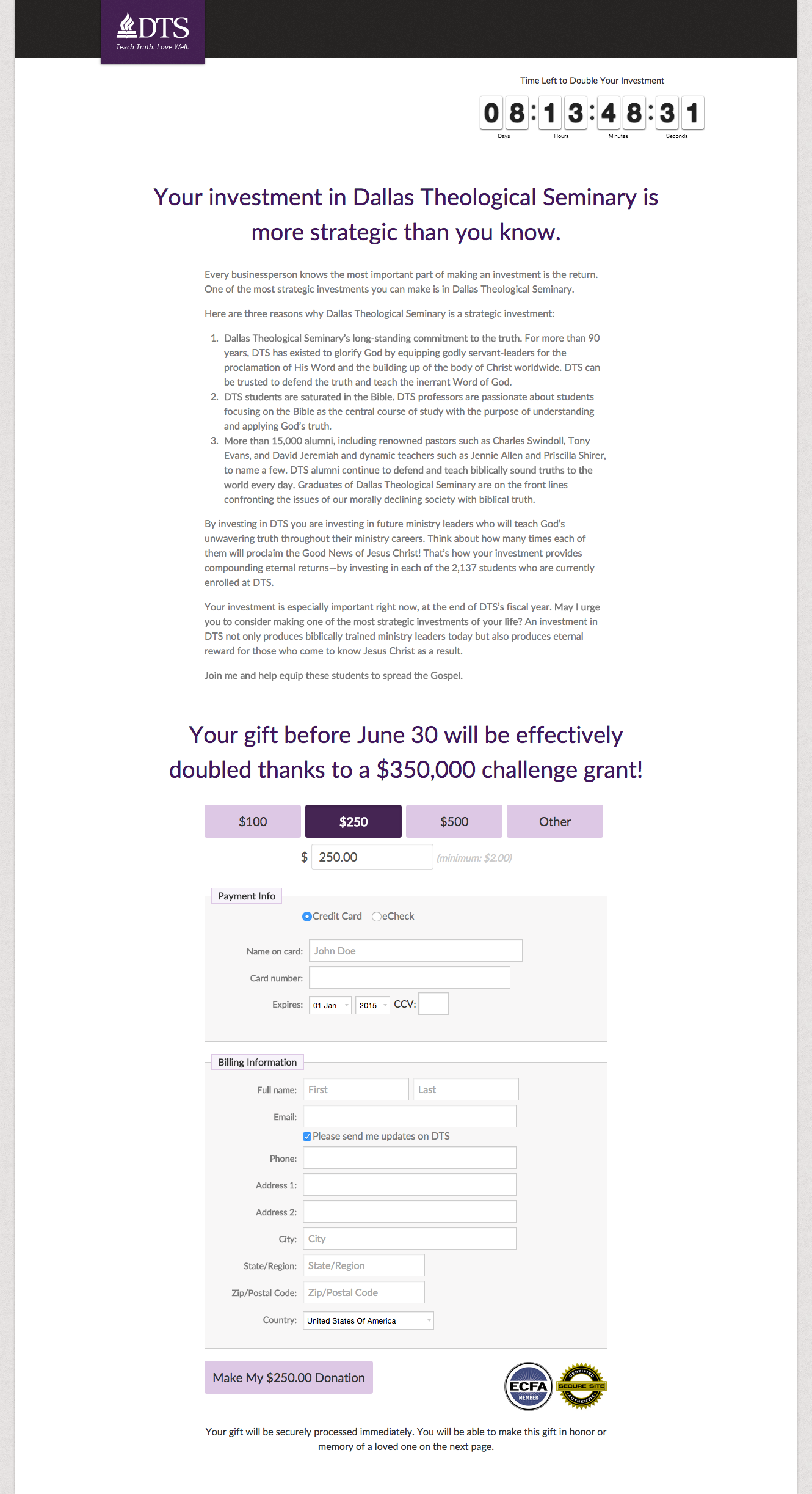 As part of their fiscal year end campaign, Dallas Theological Seminary wanted to find a way to lower the number of decisions donors had to make when giving their gift. The idea was the suggest a gift amount based upon their previous giving history with the hypothesis that this would lower the friction of the giving form.