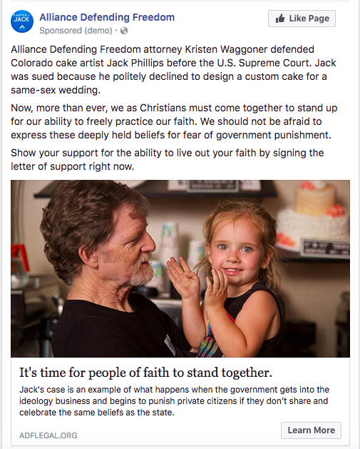 Oral arguments for Jack Phillips–a client of Alliance Defending Freedom–began on December 5th. As the news covered this national story, Alliance Defending Freedom decided to launch a Facebook ad campaign urging people to sign a letter of support for Jack. Since they knew some people were unfamiliar with Jack, they wondered: Will increasing the length of supporting ad copy on a facebook ad increase clickthrough rate? To test this, they created a longer treatment and launched an A/B test to find out.