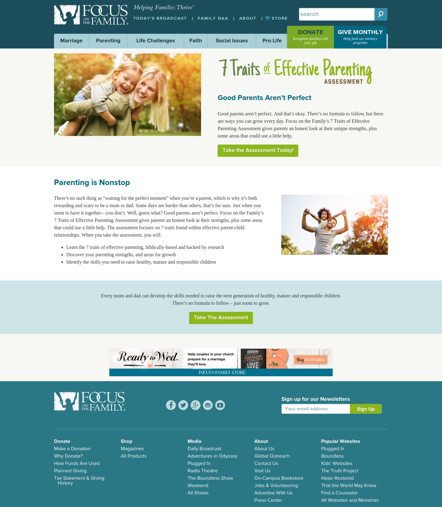 Focus on the Family offers a Parenting Assessment at the end of their parenting articles on their website. Currently, when a person clicks on the promotion feature for the assessment they are taken to a landing page where they then have to click on the a button that will take them to the assessment. We hypothesized that we might be able to increase conversion if we removed the in-between landing page for the Parenting Assessment.