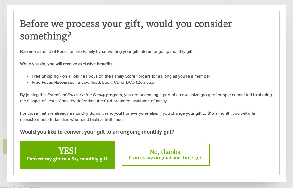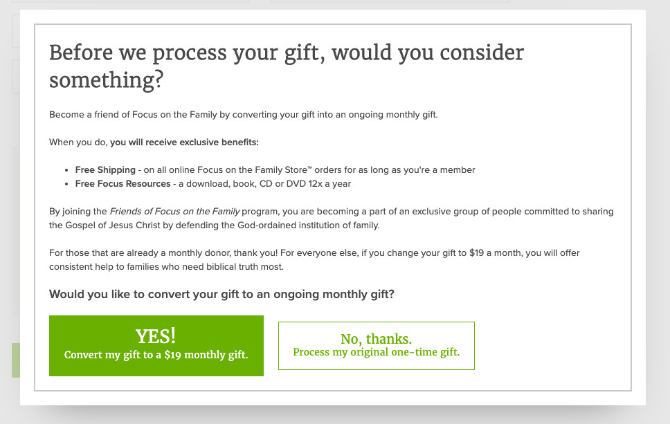 Focus on the Family had seen significant success acquiring new recurring donors through the popup recurring gift ask. The popup was a window that would appear, prior to a gift being processed, that asked the donor to convert their one-time gift into a recurring gift. We had done several iterations of experiments on the pop-up around value proposition, percentage of donation asked, and even the minimum gift amount. We learned that if the minimum gift amount was $25 and not $15, we decreased overall revenue by 49%. After reading research around the average gift for a recurring gift, we found that $19 was what the majority of people would give. Learning this, we decided to test this gift amount as a new minimum amount against our control minimum amount of $15.