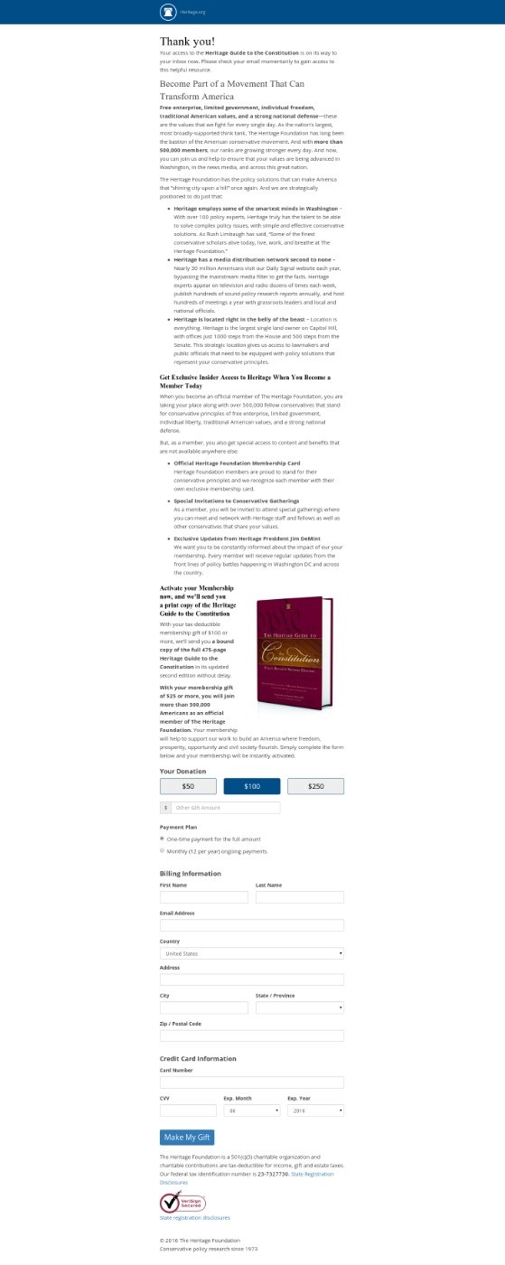 On one of their donor acquisition campaign, The Heritage Foundation was testing the use of a premium to increase conversion and average gift. Previous experiments had proven that the premium increased the likelihood of a donor to convert but we wanted to see if we could also increase to overall revenue coming from the campaign. We decided to try testing the premium at a $125 minimum gift level. The control treatment had the minimum gift set at $100.