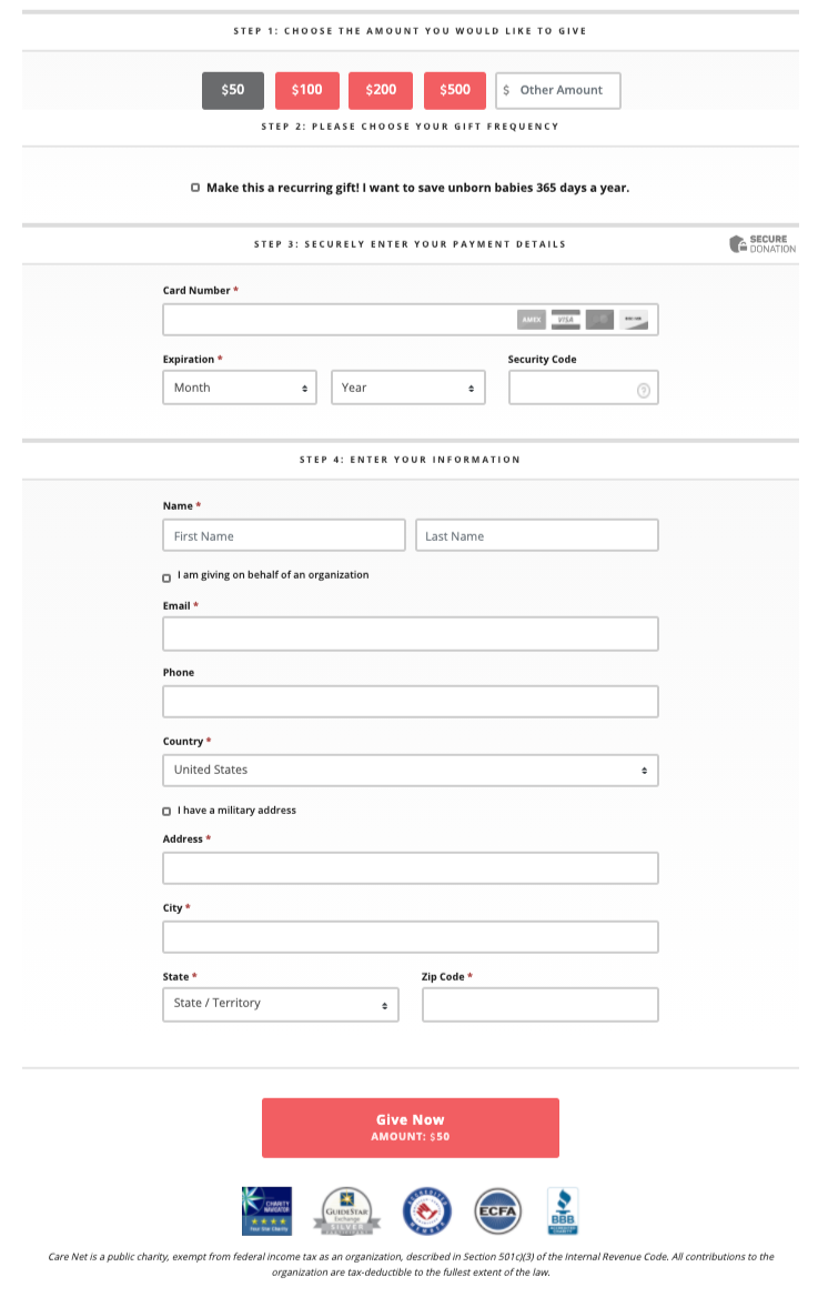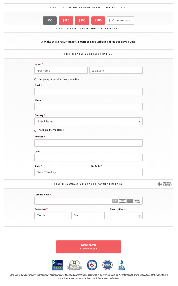 On Care Net’s primary donation page, we have been focused on optimizing the donation form in an effort to increase donor conversion. Through past research studies, and in working with many different non-profit organizations, we have found that the order in which information is acquired on the donation form varies greatly. To better understand the optimal order placement of the form fields on the page – specifically the credit card section – we decided to test it with Care Net. Care Net’s primary donation page asks for the credit card information immediately after they ask for the gift amount. This piece of information would be the second step in the donation pathway. We hypothesized that we may be able to increase donor conversion if we asked for that piece of information at the very end.