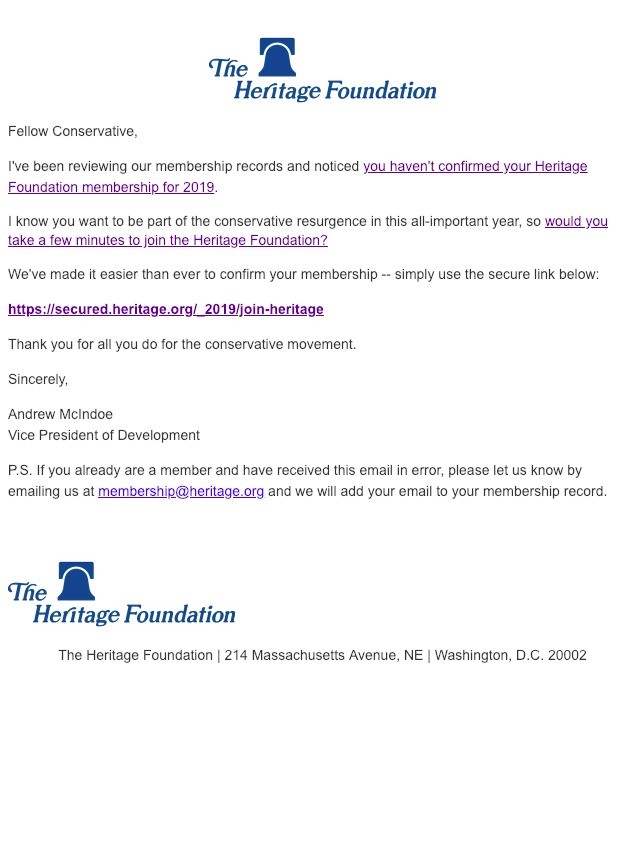 The key takeaway from this experiment is that the Heritage Foundation’s file is so accustomed to these cyclical campaigns, and that messaging for the campaign is very transactional in nature, which focuses upon the primary motivation of: “Renewing” or “Activating” your membership for 2019, that the sender, at least in the email prospecting channel, is not important.