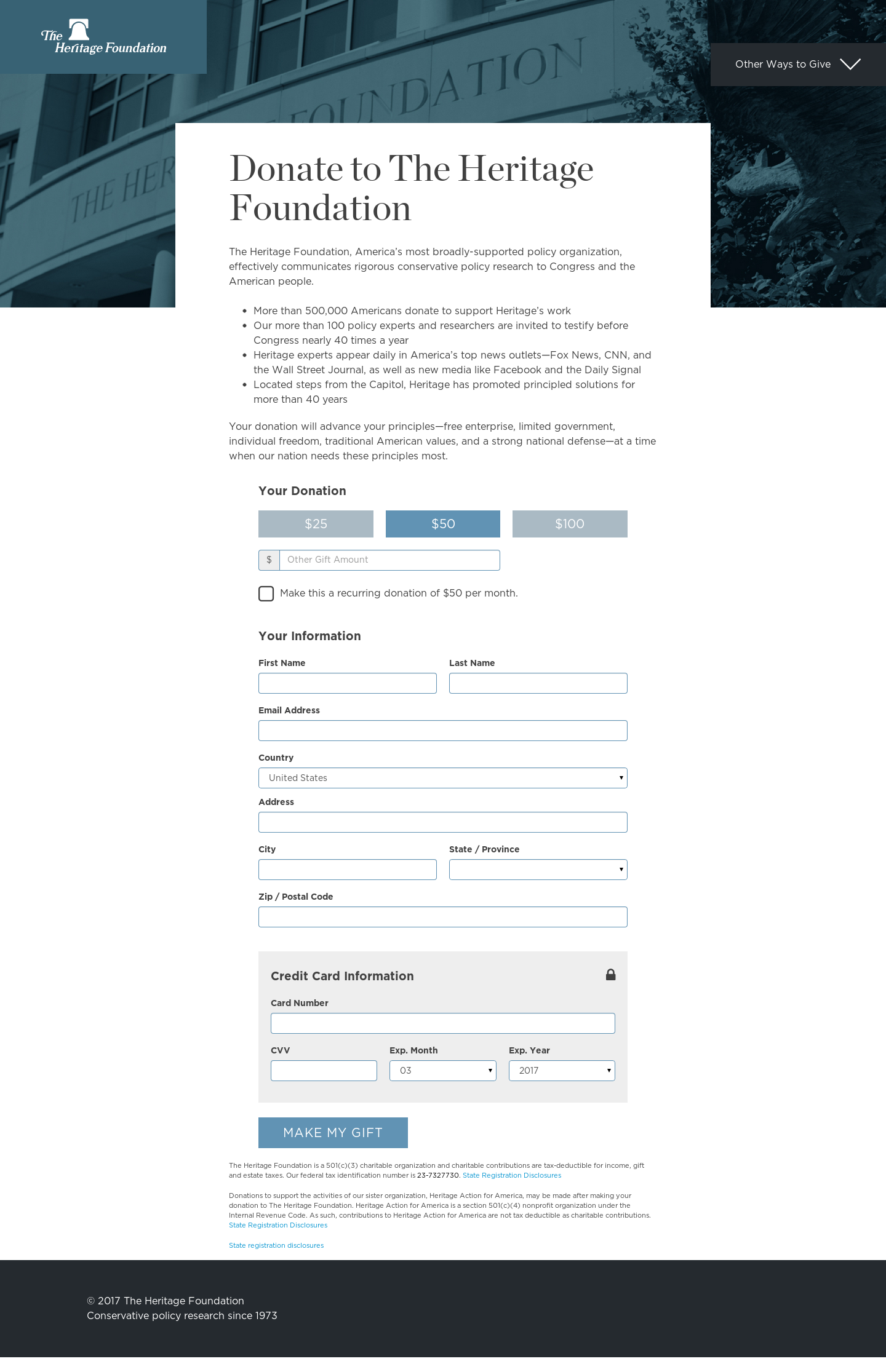 The Heritage Foundation underwent a website redesign for their primary website, Heritage.org. In order to maintain visual congruence, we updated the design of the donation forms to match the look and feel of the new site. Part of that new design incorporated a more modern style of form fields and buttons.