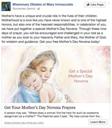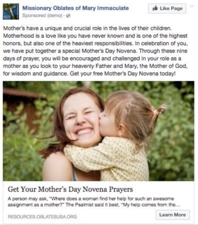 The Missionary Oblates developed a Novena prayer in honor of Mother’s Day. They promoted this content offer through paid Facebook ads in an effort to acquire new names. We traditionally use images of real people in Facebook ads, but we wanted to test the image of the ad with something more illustrated. The illustrated image was also the same image used on the cover of the Novena prayers and acquisition page.