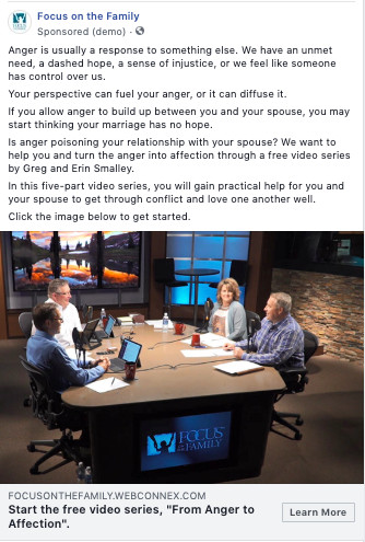 Focus on the Family has developed video series to use as new name and donor acquisition offers. These offers are promoted through paid Facebook ads that lead people to an acquisition page and an instant donation ask. They have called these offers “video series”. These 4-6 session video series also include key discussion points for each session/lesson and Scripture memory verses to help reinforce the content that people consume and learn.