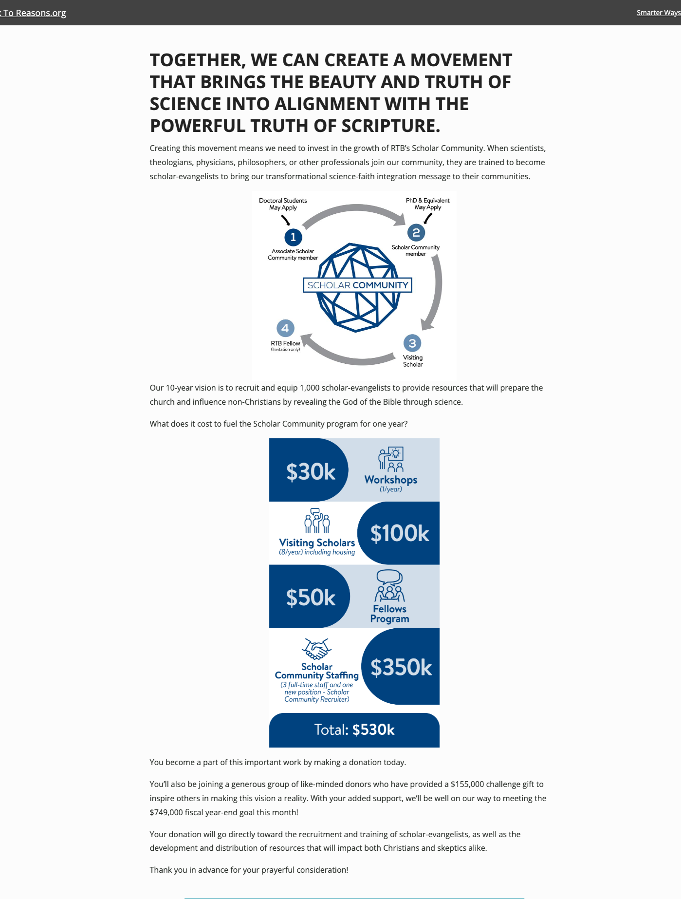 For Reason to Believe’s Fiscal Year End campaign, they had created an array of graphics illustrating their goals and the impact of their Scholar Community. We hypothesized that removing these graphics on the donation page in favor of a plain text design would lead to an increase in donor conversion rate. Note that any copy in the images was translated into bullet points for the plain-text treatment.