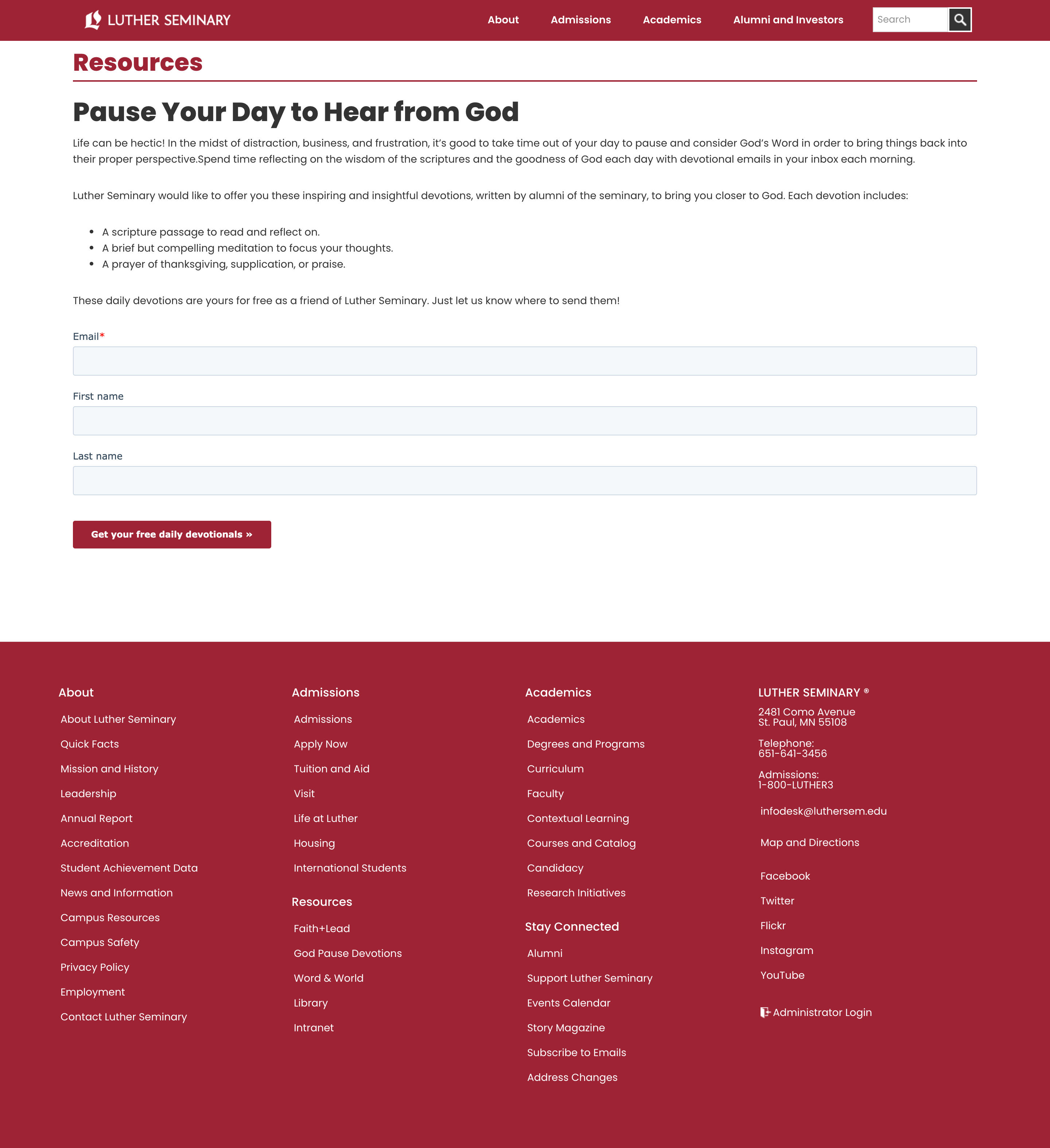 With this experiment, we are testing Luther Seminary’s daily devotional called GodPause. This was a radical redesign where we tested removing the header tabs, footer tabs, added the same image we used on the Facebook ad, shortened the form field length, as well as updated the copy on the page. With the copy changes, we did use the word GodPause as new names don’t know what GodPause is. So we changed the copy to talk more about the use case and benefits of this daily devotional.