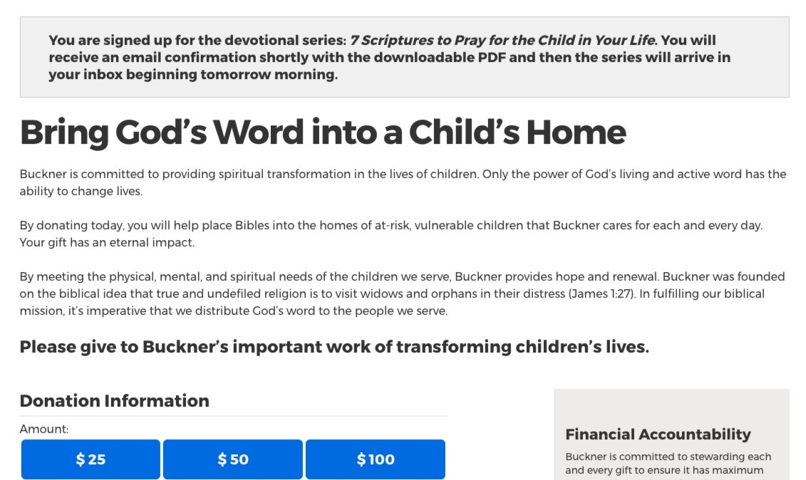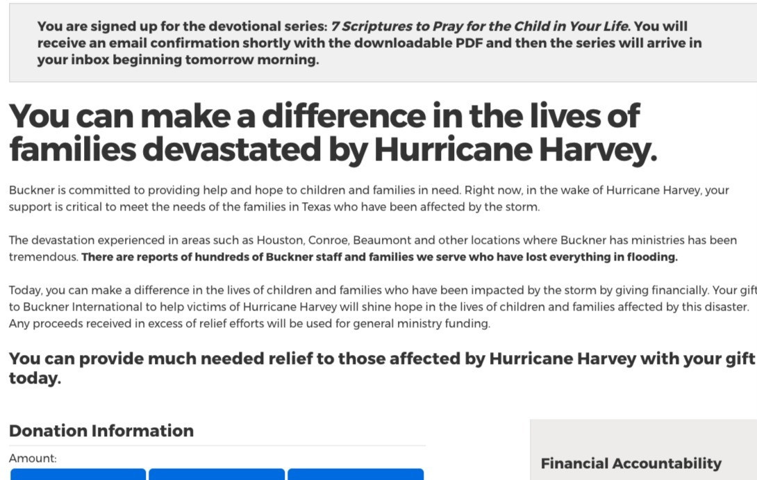 Buckner was testing more urgent copy for an immediate need on the donation page of their content offer, 7 Scriptures to Pray for the Child in your Life. The immediate need focused around Hurricane Harvey and the Buckner staff and families affected by the disaster. The ads and acquisition page for the offer remained the same.