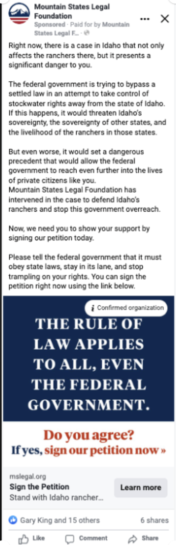 MSLF decided to test this concept on their Idaho Stockwater petition campaign in Facebook. To test this, they had one campaign with a typical-looking Facebook ad and a second campaign with just an image that looked like an organic post.