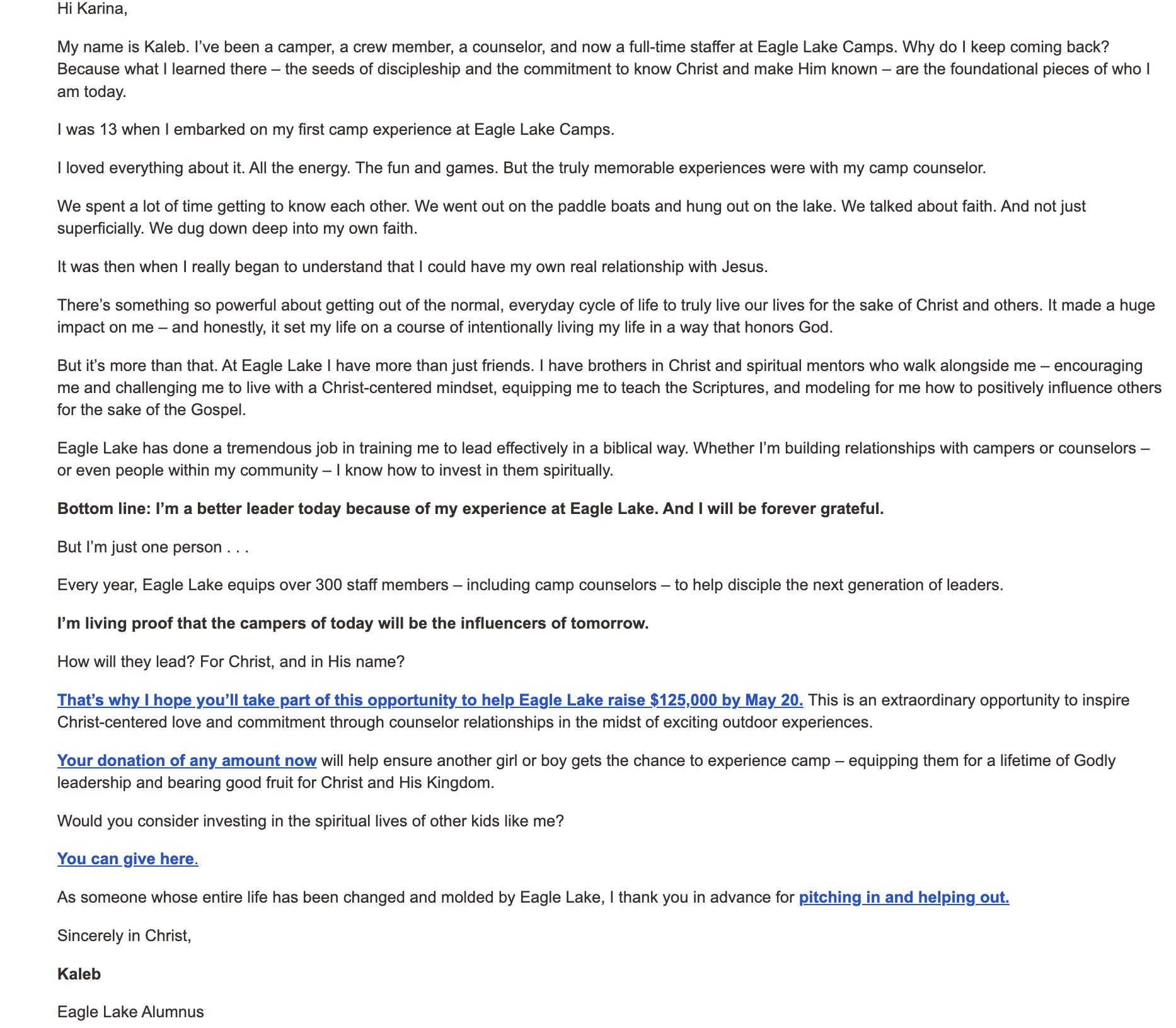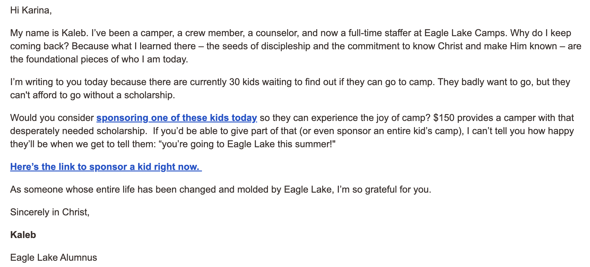 Navigators was running a high urgency campaign for Eagle Lake. They had slow traction for the first half of the campaign so we wanted to test using more direct, specific language in their email appeal. The previous emails had passive language that encouraged the prospective donor to “support the next generation.” Instead, we wanted to tell them specifically to send a kid to camp. For additional specificity, we added how many students still needed scholarships and how much it cost to send one child to camp. Our hypothesis is that this will give the prospective donor a clearer, more tangible goal and in turn would generate more donations.