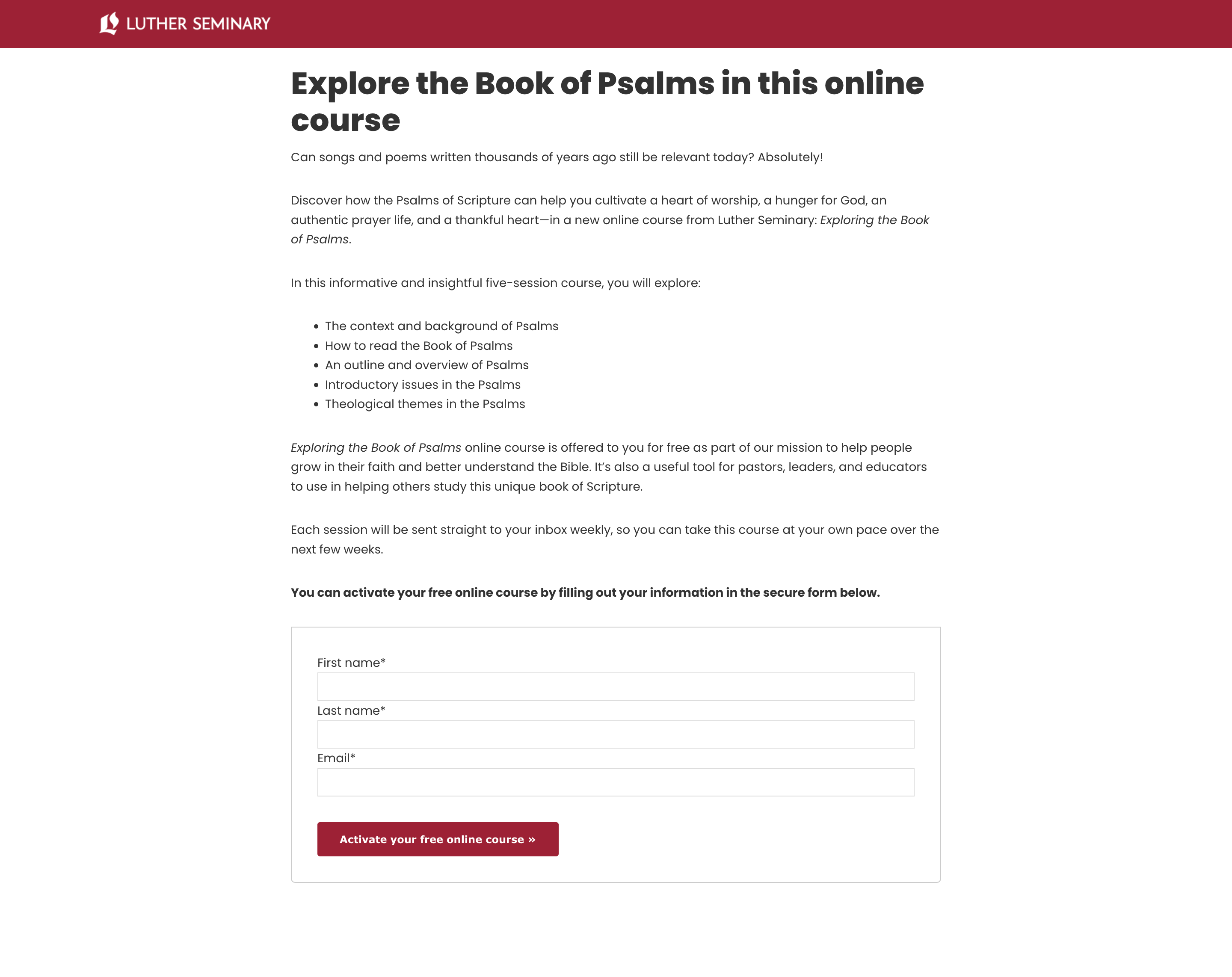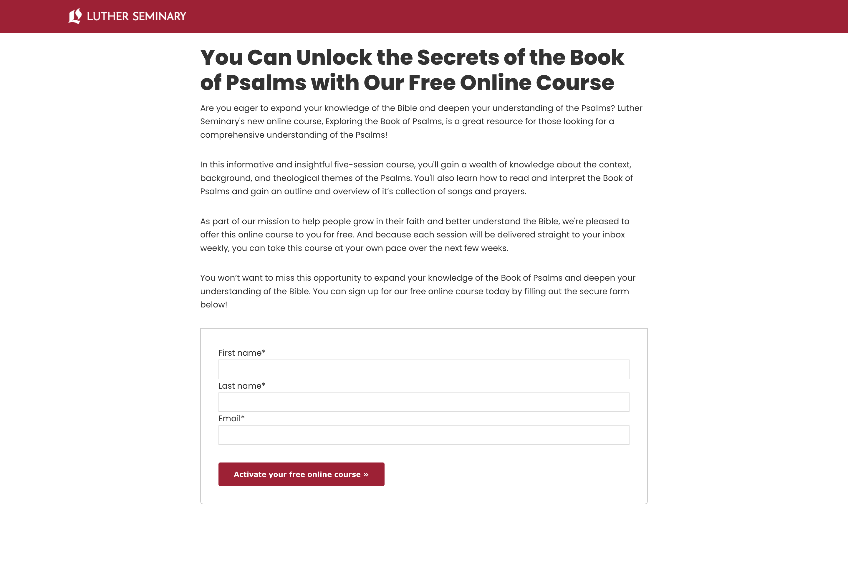 Luther Seminary is offering a free online course of the Book of Psalms. They wanted to try and increase the email conversion rate on the sign-up page for the course, so we decided to test using language around gaining a deeper knowledge of this book of the Bible while enhancing their faith. We did this in two ways: