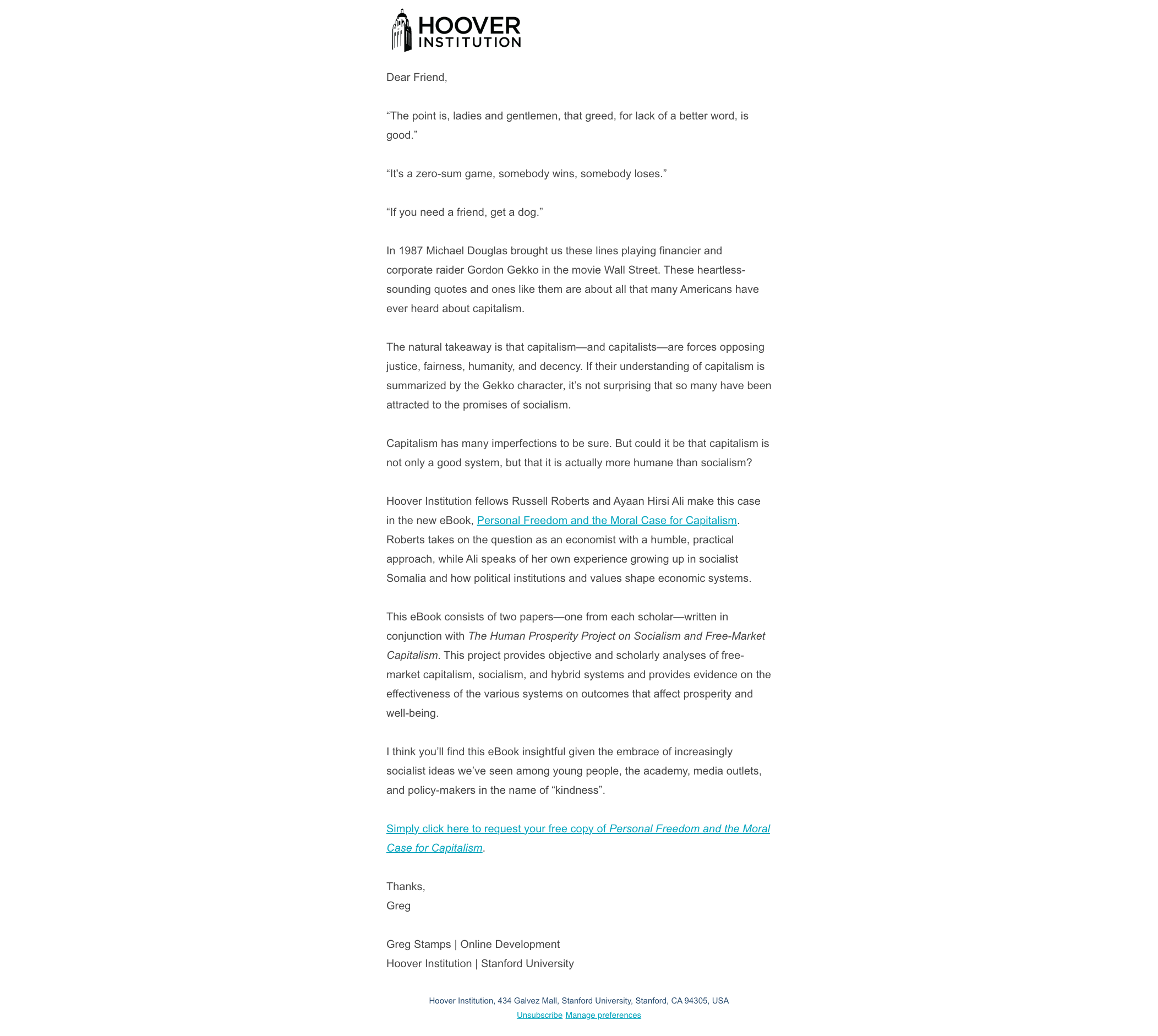 Hoover recirculates a new content offer every Thursday by sending out an email to their Donor and NonDonor audiences. For this specific recirculation of one of Hoover’s most popular offers, Personal Freedom and the Moral Case for Capitalism, we wanted to see whether copy that focused more on the offer, and not use pop culture references, impact email and content offer performance. This experiment was for their non-donor audience.