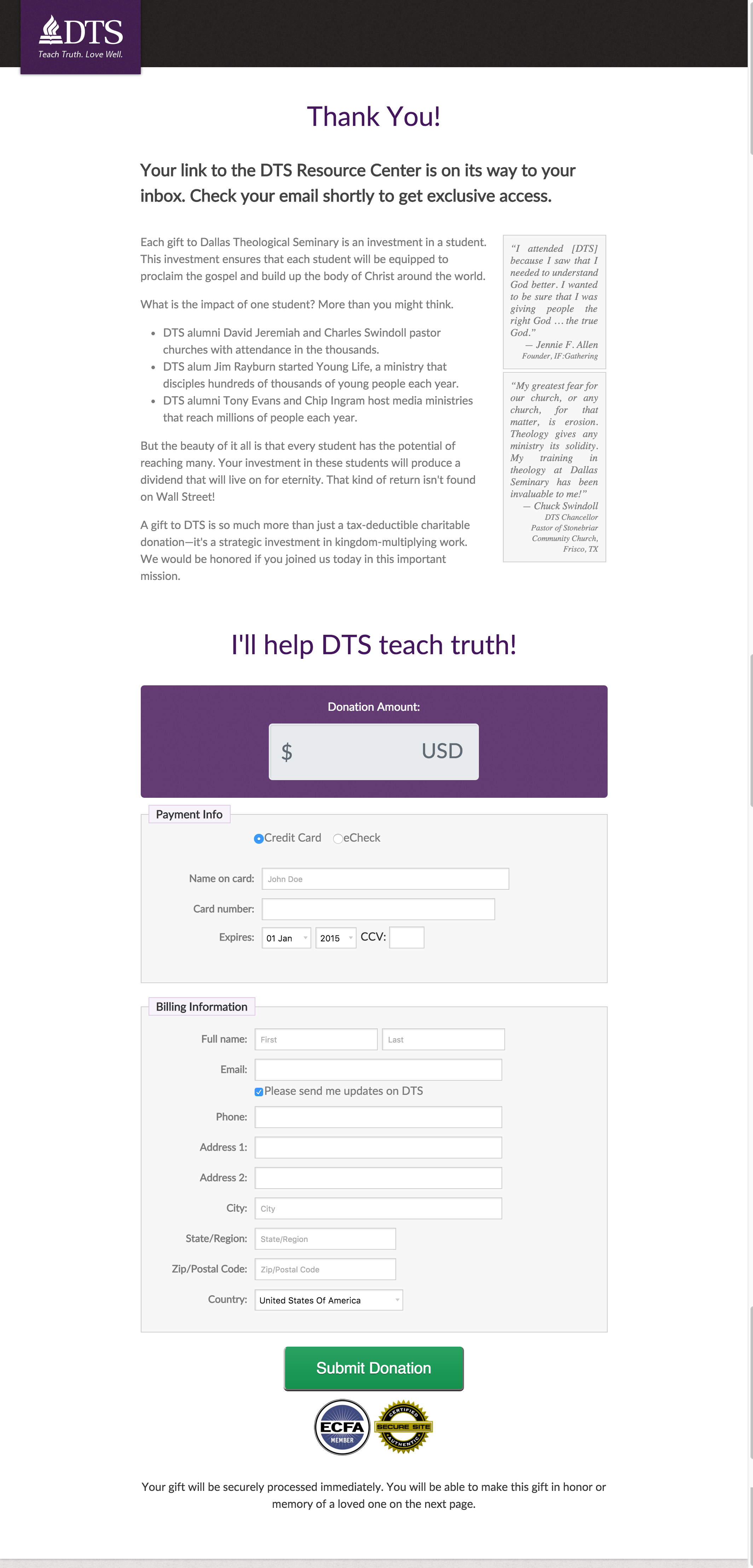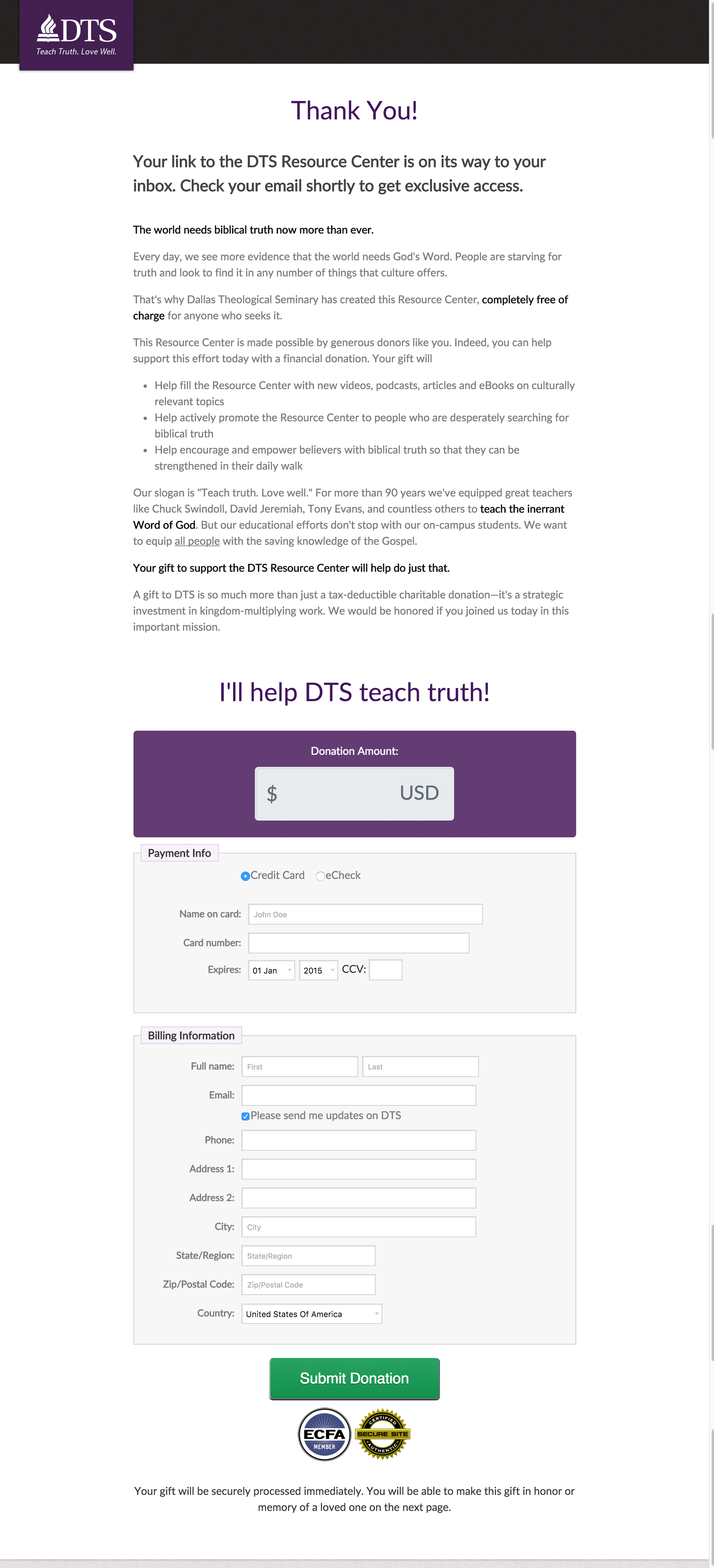 DTS launched a resource center for biblical perspectives on today’s issues. The goal of this resource center was name and donor acquisition. Immediately after the signup page was a donation ask. DTS wanted to test messaging on the donation page to determine which value proposition was stronger: an ask for an investment in a student or an ask centered around teaching biblical truth.