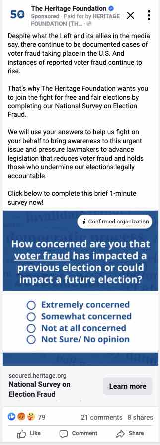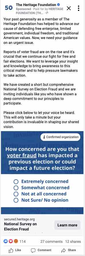 The Heritage Foundation was showing ads to lapsed donors to reactivate them to active donors. However, these ads were originally developed for acquisition. They wanted to test the impact of adding “acknowledgement” language of the donors’ past giving history to the ad copy, with the thought that it might personalize the copy and make the donor realize that they were being spoken to directly.