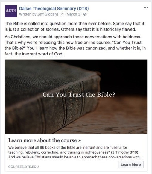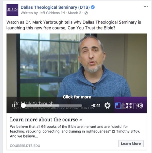 DTS was promoting their new course, called Can You Trust the Bible?. They had a special video from their Academic Dean to promote it and wanted to test using this video to promote the course. Video ads had shown in some experiments to improve conversion for offers, although DTS had previously used static ads.