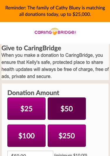 CaringBridge was running a Valentine’s Day fundraising campaign and had a $25,000 matching gift. They knew that most of their donations on these short, high-urgency appeals came through a few donation funnels that landed on the same page. While previous tests had focused on driving traffic, they wanted to see if they could optimize conversion by driving home the match language on the two days that the gift was applied. They created two versions of a sticky top banner for the donation page—one that emphasized the match for “your” gift, and another that emphasized the match for “all donations”. They launched a three-way experiment split between mobile and desktop to see how it affected conversions on mobile devices.