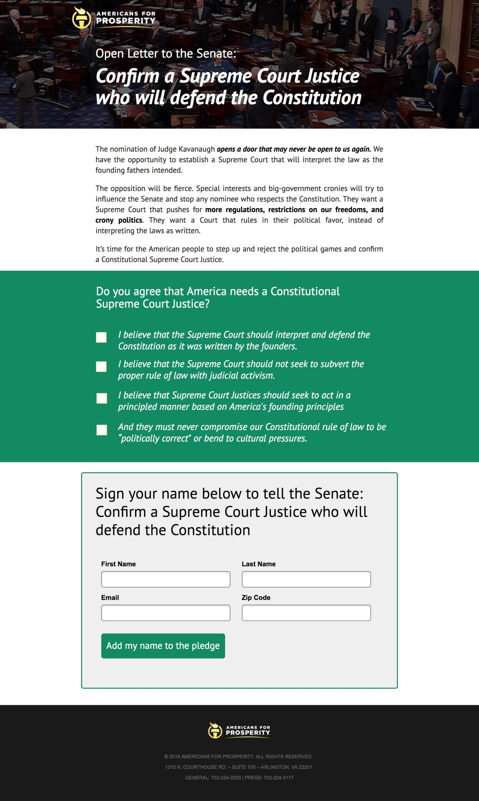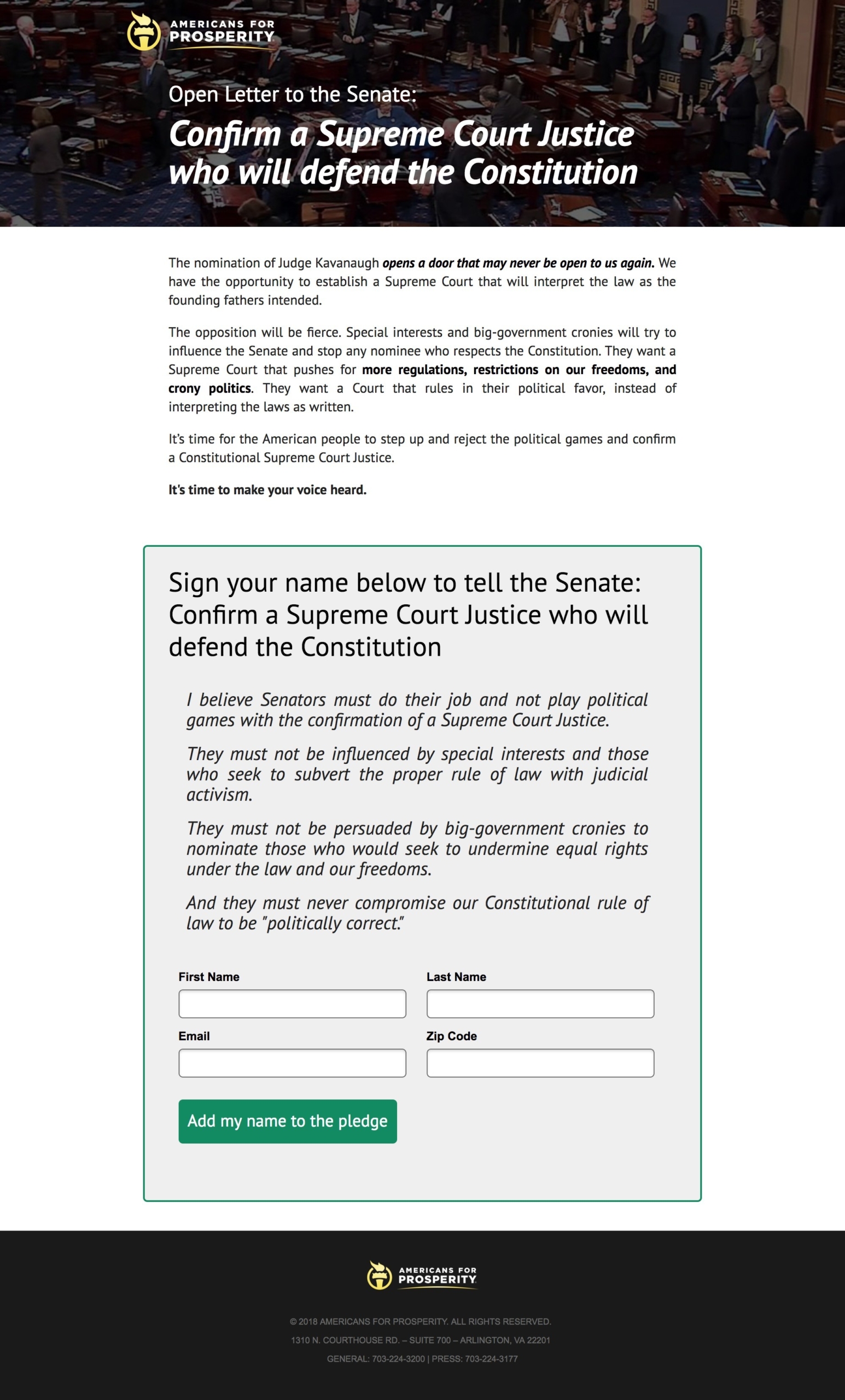 As part of the Open Letter to the Senate regarding the upcoming Judge Kavanaugh confirmation hearings, we tested a variety of different tactics to increase the number of emails we were acquiring. What we discovered was that, given the high motivation of the visitors to the Open Letter, we were not able to make significant improvements to conversion with any tests. As a result, we decided to shift our efforts to see if we could make changes on the email acquisition page that would improve downstream donor conversion.
