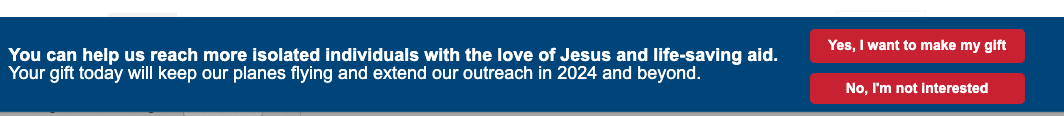 One simple but powerful way to encourage donors to take action is by giving them a small choice up front. In this test, the idea was to use “yes/no” language in a sticky bar at the top of the homepage. Rather than jumping straight to a donation ask, the message first invited visitors to make a micro‑decision—a quick yes or no—before leading into the giving opportunity.