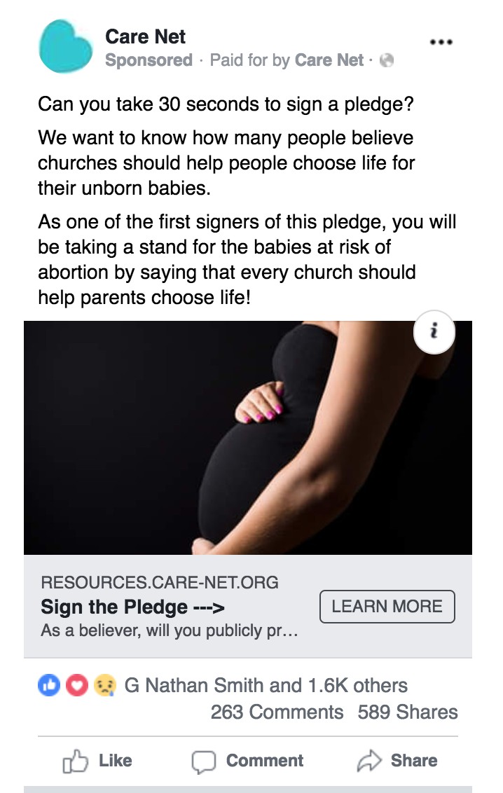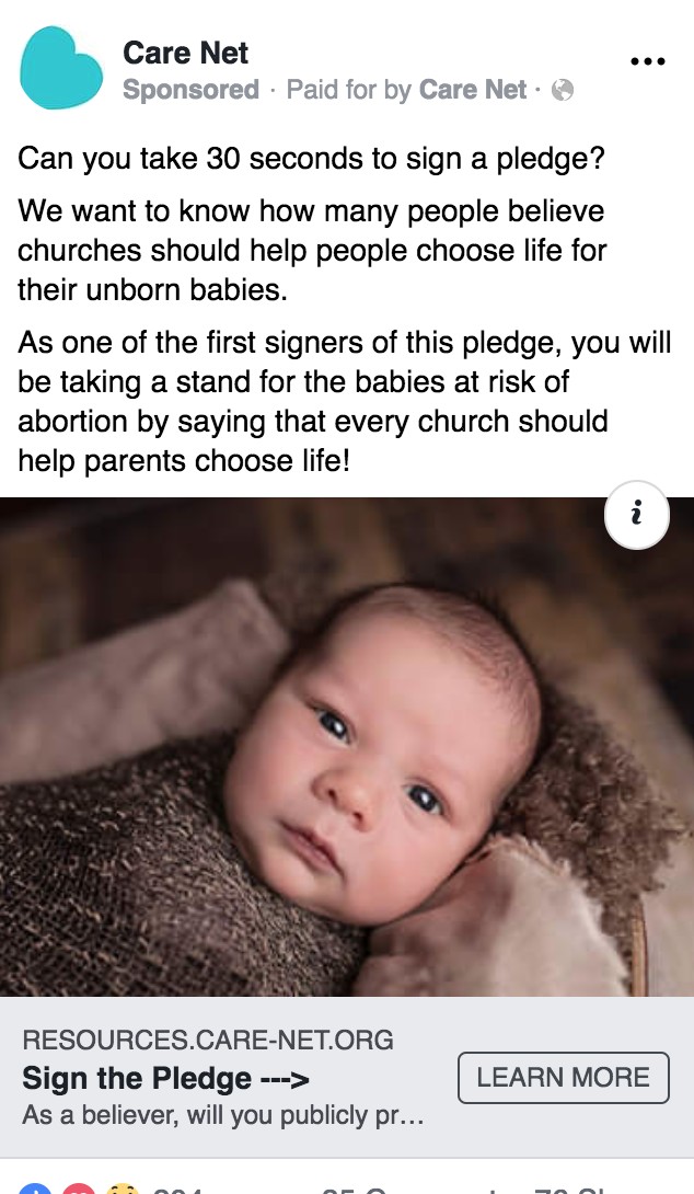 We have an MLD pledge we use to introduce people to MLD and ask them to become volunteers. We wanted to increase the number of volunteers that sign-up. We knew that baby images were performing well in other tests, so we decided to try it in this Facebook ad.