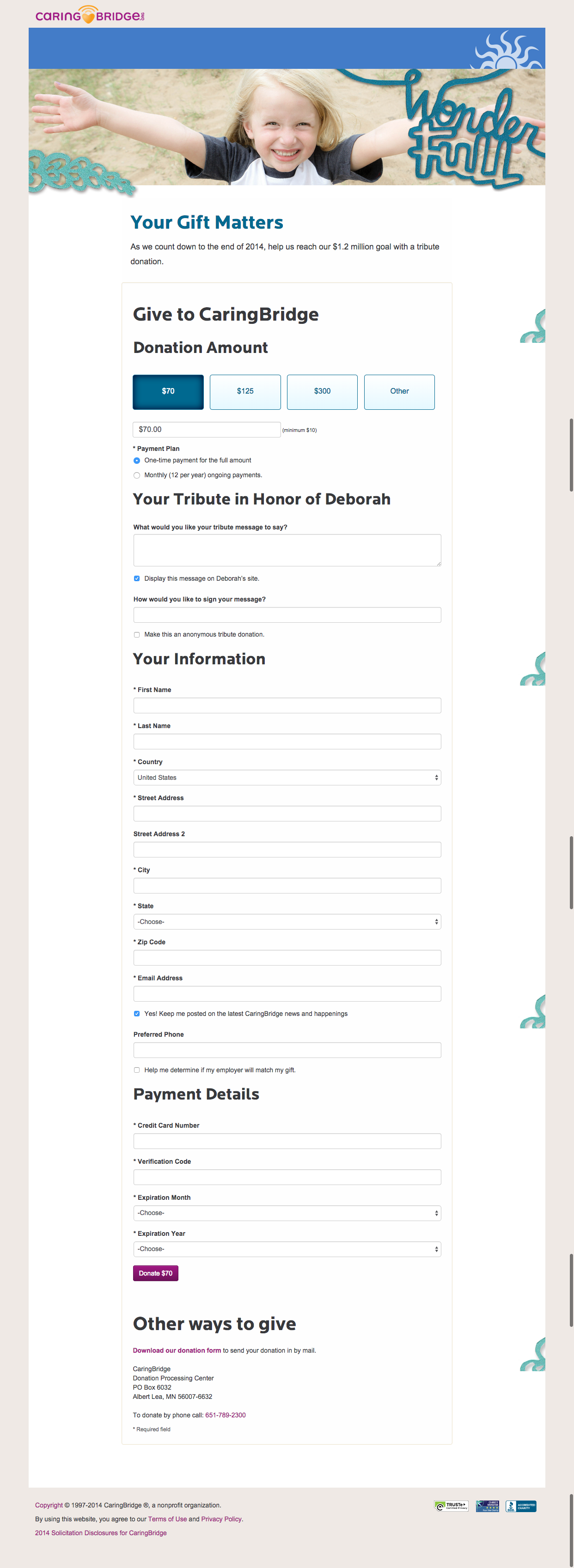 CaringBridge was in the final week of their 2014 year-end fundraising campaign and expected traffic to dramatically increase to their donation pages. They wanted to maximize on-page conversion by adding elements to the page to increase urgency: reminding people of the proximity to December 31st.