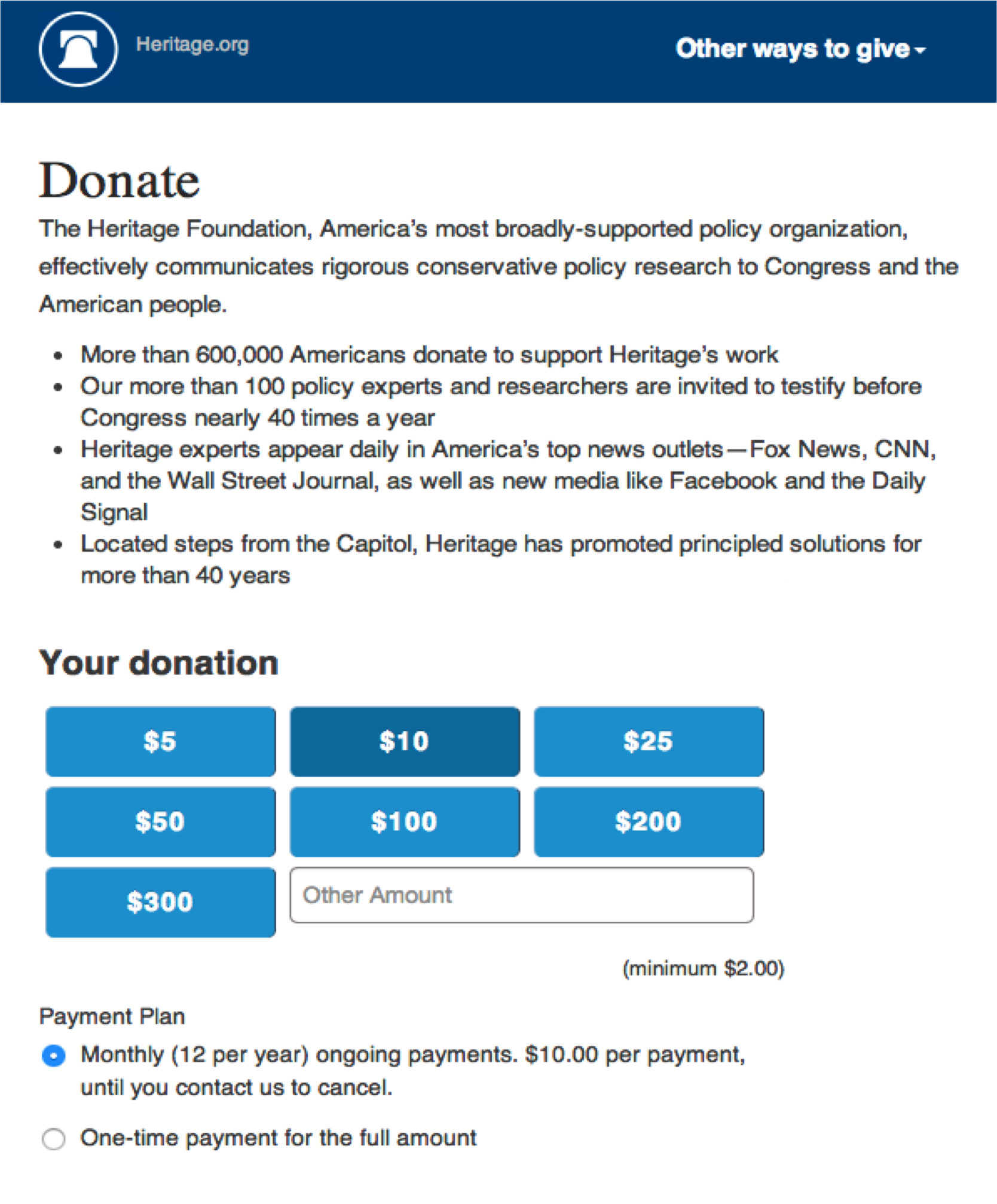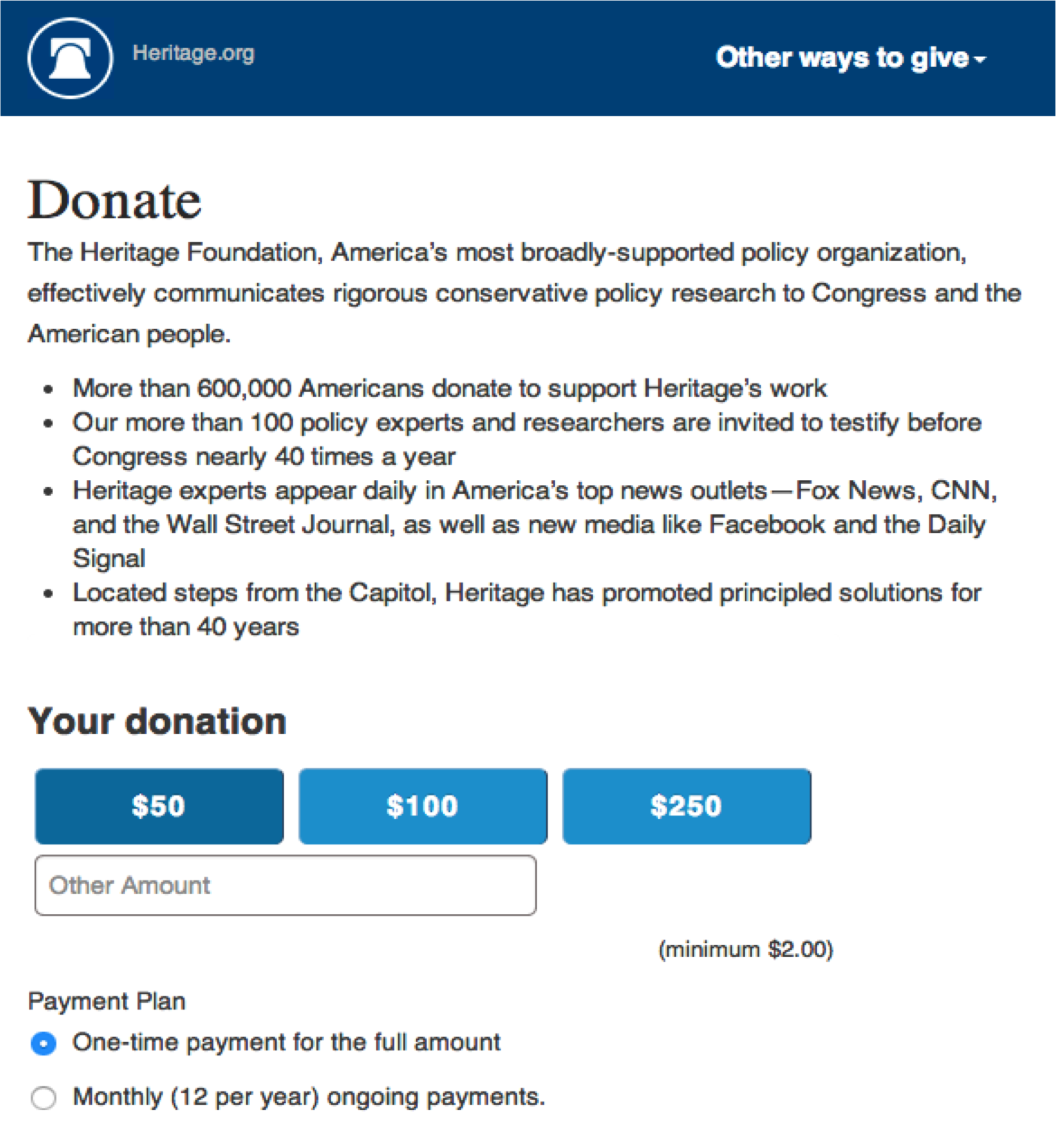The main donation form for The Heritage Foundation had historically contained 7 different suggested gift amounts and had preselected the monthly recurring gift option. The original theory was that we wanted to address the range of gifts we saw coming in from donors and wanted to encourage them to become monthly donors. In an effort to improve the overall conversion of the form, we wanted to find a way to reduce the decisions donors had to make. At the same time, we did not want to reduce the number of monthly donors or the overall revenue impact that comes with higher average gifts. This meant we had to monitor multiple factors with this experiment. To test our hypothesis, we created a new treatment with a smaller suggested gift array and preselected the one-time gift option.