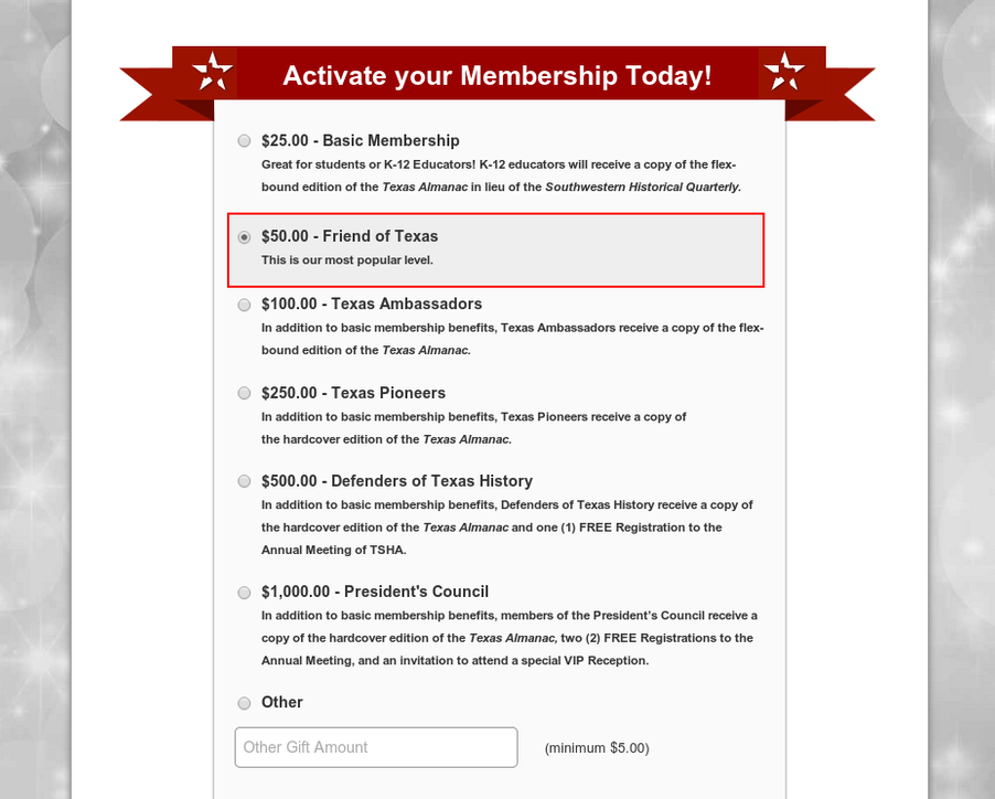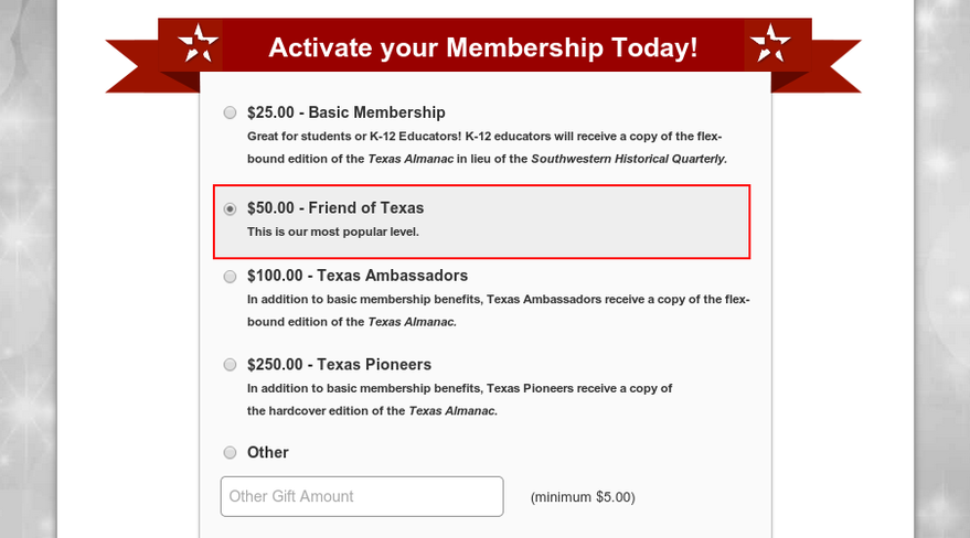 During their calendar year end campaign, the Texas State Historical Association created a landing page dedicated to acquiring new members. Their membership program consists of 6 different levels ranging from $25 up to $1,000.  After analyzing previous year end campaigns, we realized that the number of new members that select gifts above $250 are few and far between.