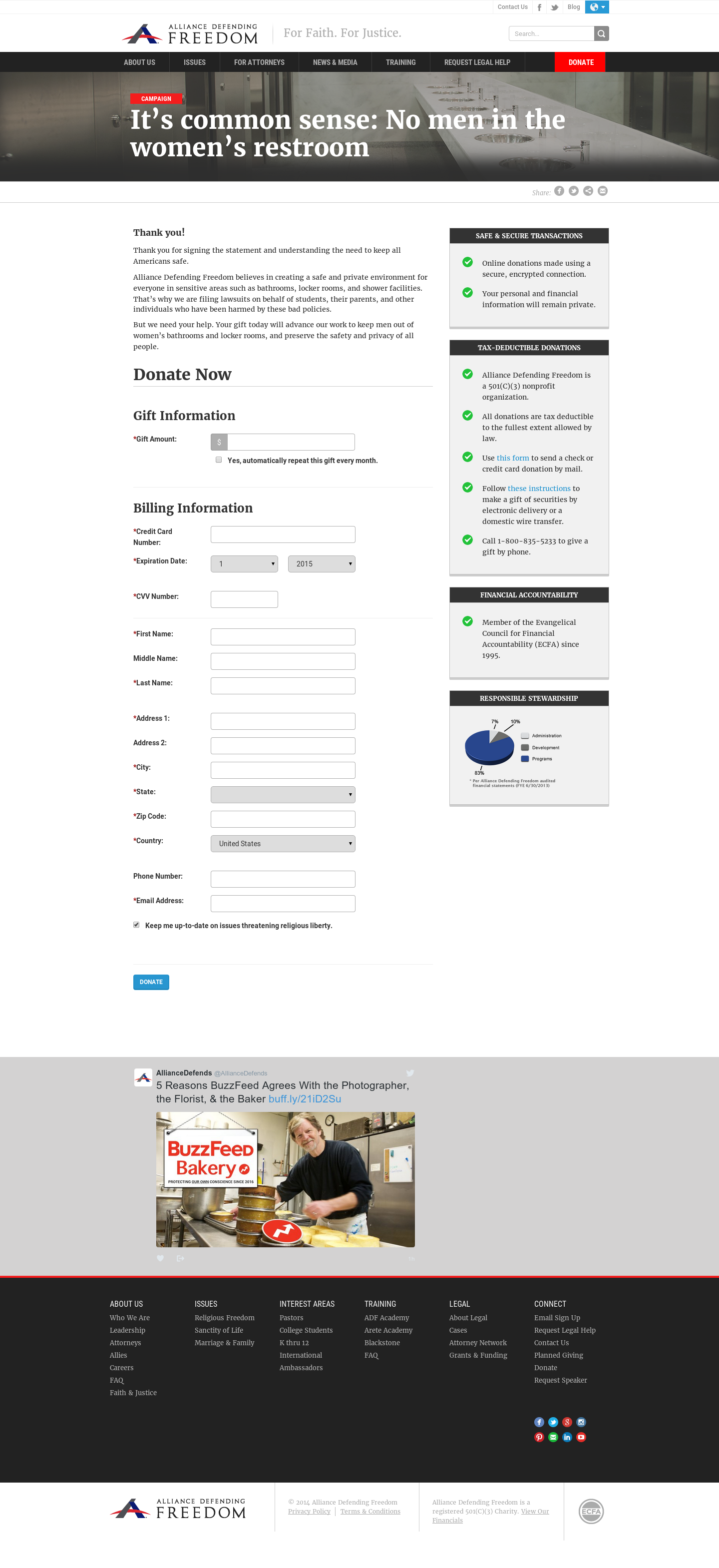 After the Safe Bathroom campaign initially launched, we noticed that the donation page had a relatively low conversion rate of 1% to 2%. After examining the donation page, we decided to run a radical redesign that would reduce the length of the page while reinforcing the reason they initially signed the pledge that led them to this page. This radical redesign would also bring in imagery from the original page to try to reinforce that original value proposition.