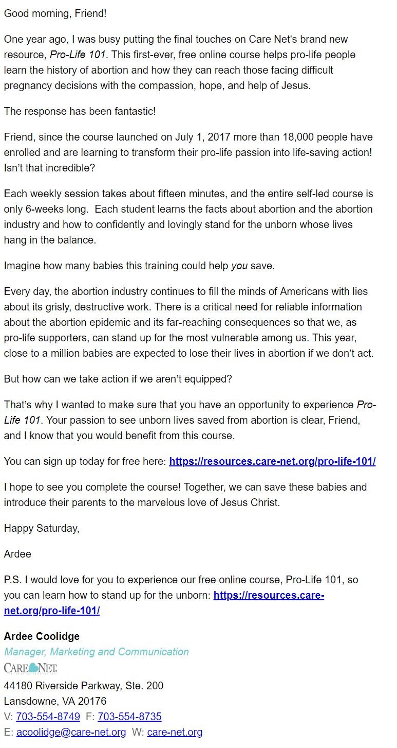 We decided to market our free online course to subscribers who had not yet enrolled. In crafting our emails, we wanted to know if adding a second signup CTA as a P.S. would lead to more people clicking through to the landing page.