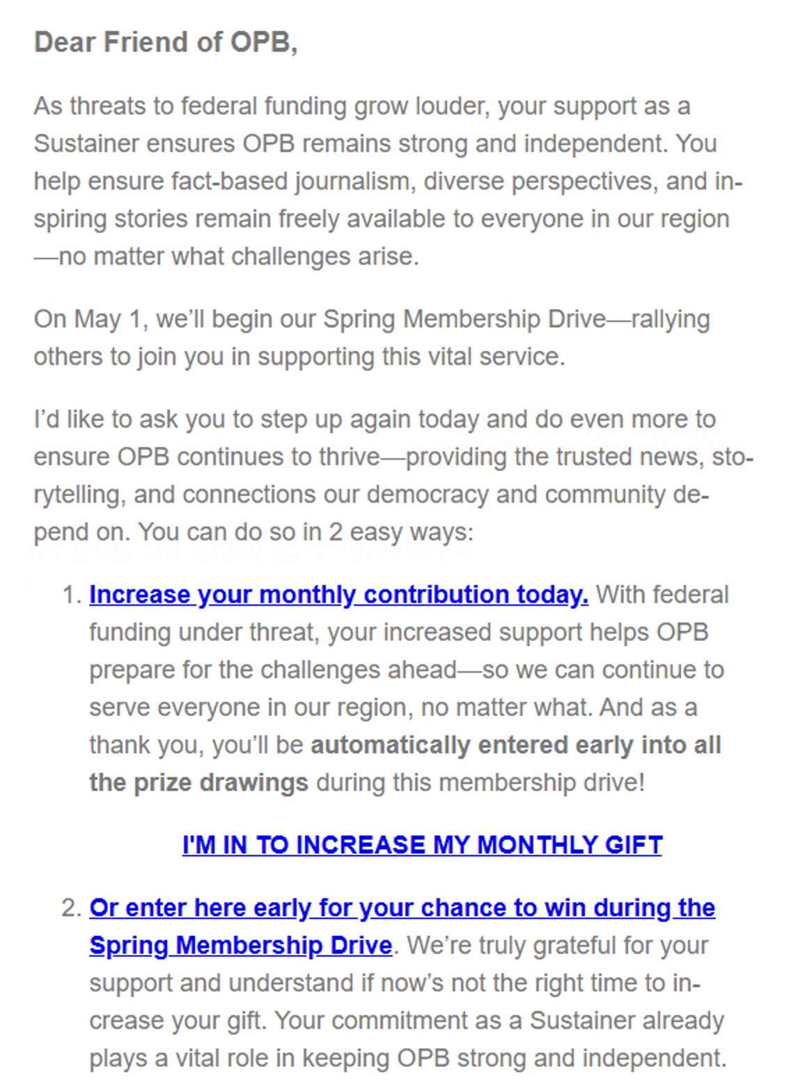 This experiment was conducted for Oregon Public Broadcasting (OPB), an NPR station serving communities across Oregon, for their May Fund Drive. The goal was to test messaging strategies in a pre-drive email specifically targeted to current sustainers.